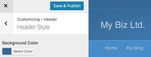 Having no color set can lead to a surprise in Customizer. For example, suppose you choose the Bold preset, for which the header background is blue: