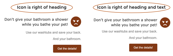 Position You can choose for the icon to appear above or below the heading or to the left or right of just the heading or the heading and text both. If there's also a button or link, the photo is vertically centered to the left or right.