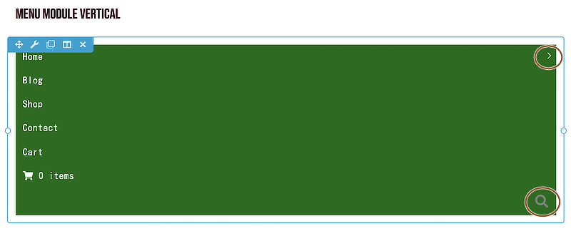 The following screenshot shows a vertical layout with a color background in the same column. The menu's boundary is sized to fill the column width and the submenu and search icons are right-justified. You can adjust the width of the module by changing the column width or adding margins or padding to the containing row or column, or increase the margin of the Menu module itself.