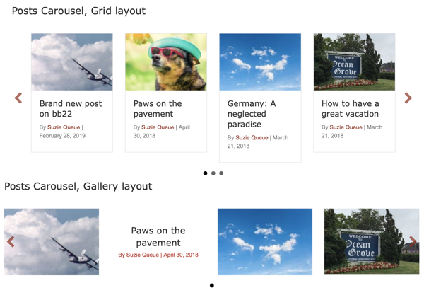 In the Posts Carousel module, a set of posts or pages is displayed as a single row of posts in either Grid layout (with post title and info underneath the featured image) or Gallery view (with post title and info replacing the featured image on mouseover), as shown in the following screenshots of the two layouts.