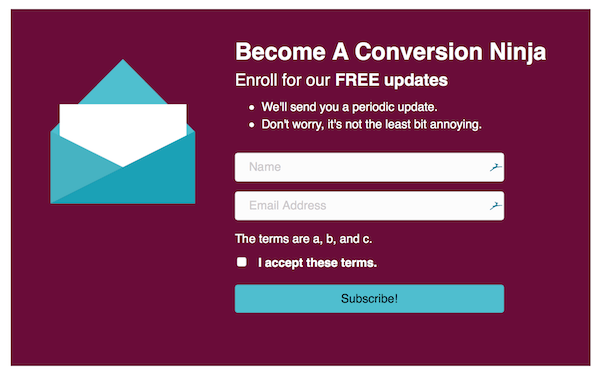 Here's an example of the Subscribe Form module as used in the Sign Up content template included with the Beaver Builder plugin. An example of the Terms and Conditions checkbox has been added to the template. If you enable this option, users must select the checkbox to submit the form successfully. If they don't, they receive the message "You must accept the Terms and Conditions."