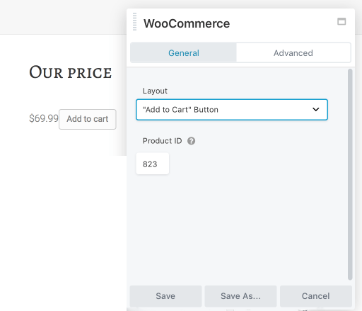 In the WooCommerce API, the product price and Add to Cart button are displayed as a unit, and you can display this part of an individual product without showing the rest of the product, as shown in the following screenshot, in which there's a Heading module that says "Our price," then a WooCommerce module with Layout designated "Add to Cart" button.