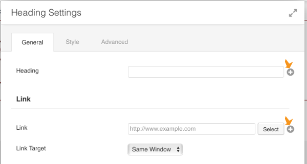 These plus signs indicate that you can set field connections to add information from your site's database. In the screenshot example above, the field connection was set to display the site title as the heading text and use the site's URL as the link. This means that whenever you change the title of your site or its URL in your WordPress settings, your site automatically reflects the new information.