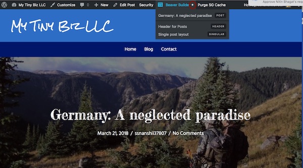 For example, the following screenshot shows a single post. In the WordPress admin bar you can see that the dot following Beaver Builder is white, indicating that the post content doesn't have a Beaver Builder layout. The submenu indicates that there's a Header-type Themer layout and a Singular-type Themer layout applied to this page.