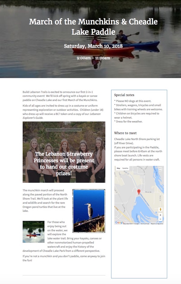 The following screenshot shows an example of a custom post type called Events. The post title row includes two custom fields for event date and time, and the featured image of each custom post is set to display in the row background. In the row below the image, the left column shows the post content, and the right column displays three custom fields (special notes, where to meet, and a map).