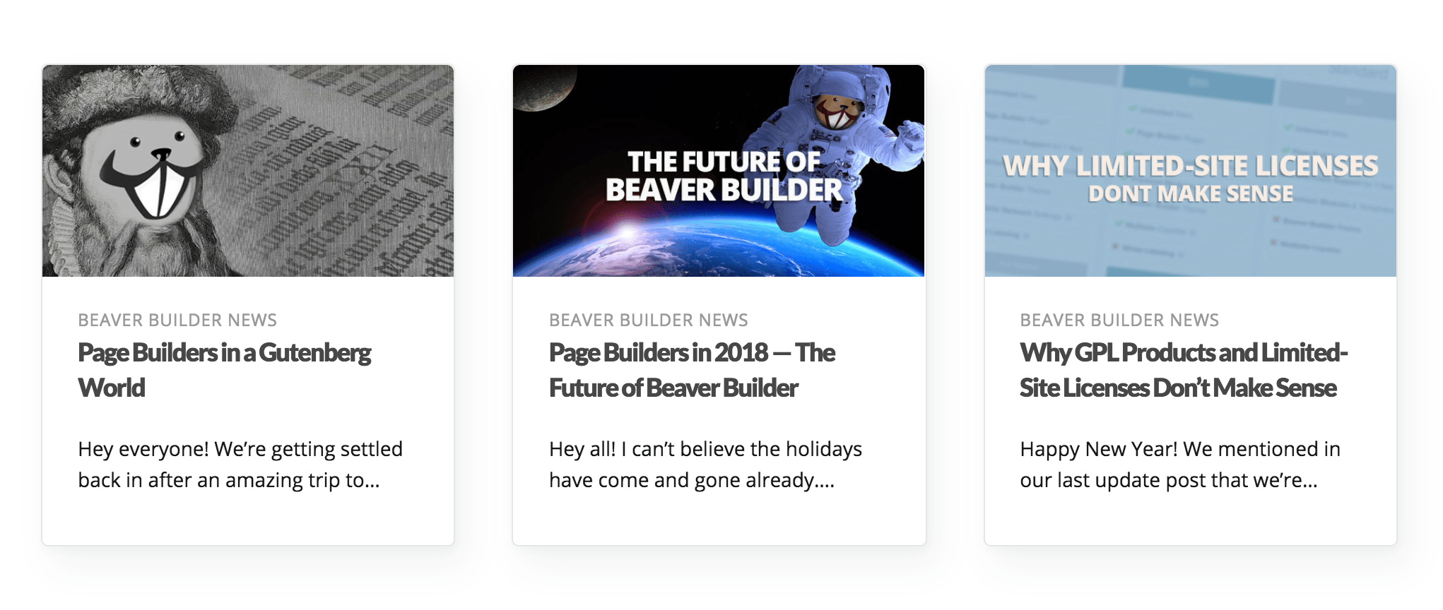 This procedure shows how to create a basic card layout, such as the one shown in this screenshot. This layout requires that Beaver Themer is installed but works both in Themer layouts and in regular Beaver Builder layouts for pages and posts.