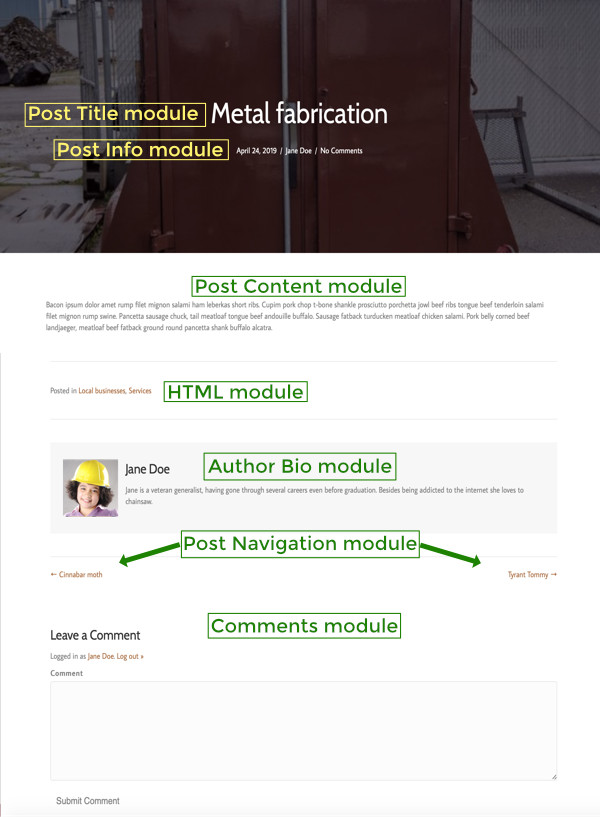 - It has special Themer modules that display post title, author, date, category, comments, post navigation, and featured image, as shown in this screenshot.