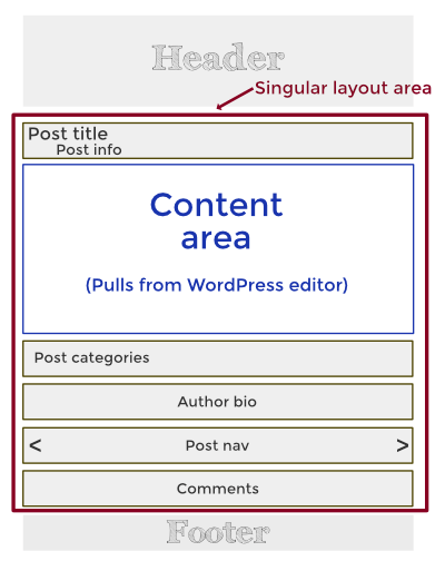The Singular layout includes the parts of the page shown in the following diagram, which includes standard information that is associated with single posts: the post title and post info, post content, post categories or tags, an author bio, post navigation, and post comments.